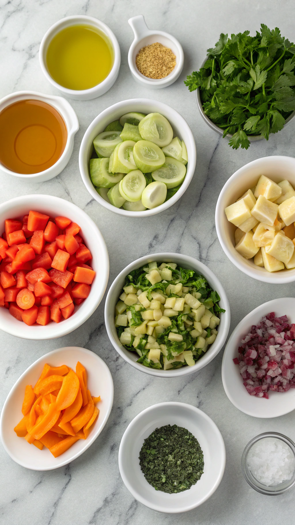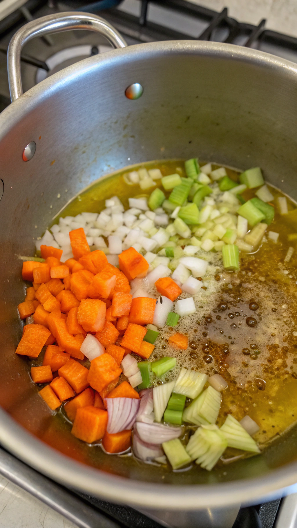 - Heat the olive oil in a large pot over medium heat. Add the diced onion, carrots, and celery and cook, stirring occasionally, until the vegetables begin to soften, about 5 to 7 minutes.