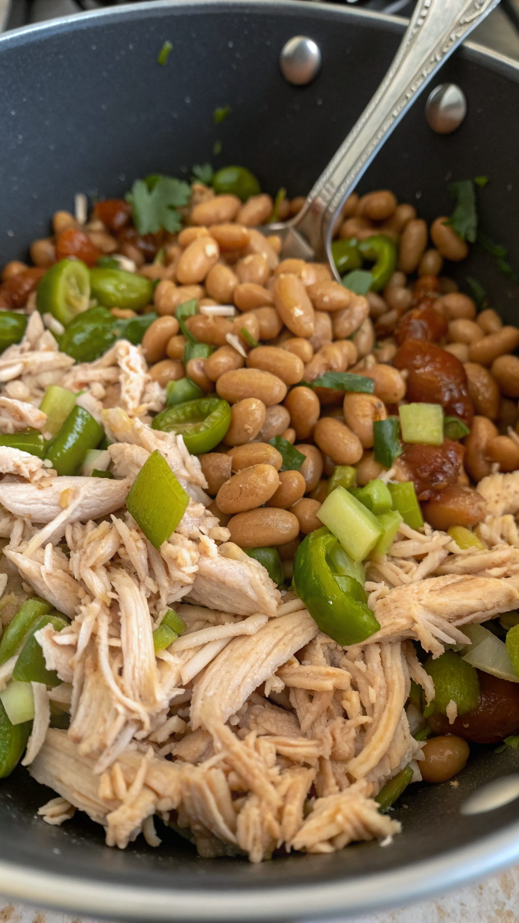 Step 2: Add chicken, broth, beans, and chiles
